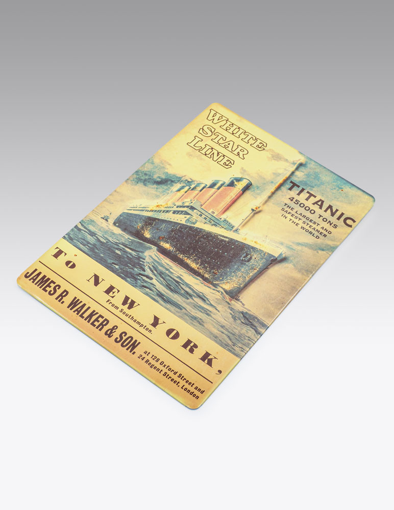 Revive la fascinante historia del Titanic con esta placa decorativa inspirada en los míticos carteles promocionales de la White Star Line.